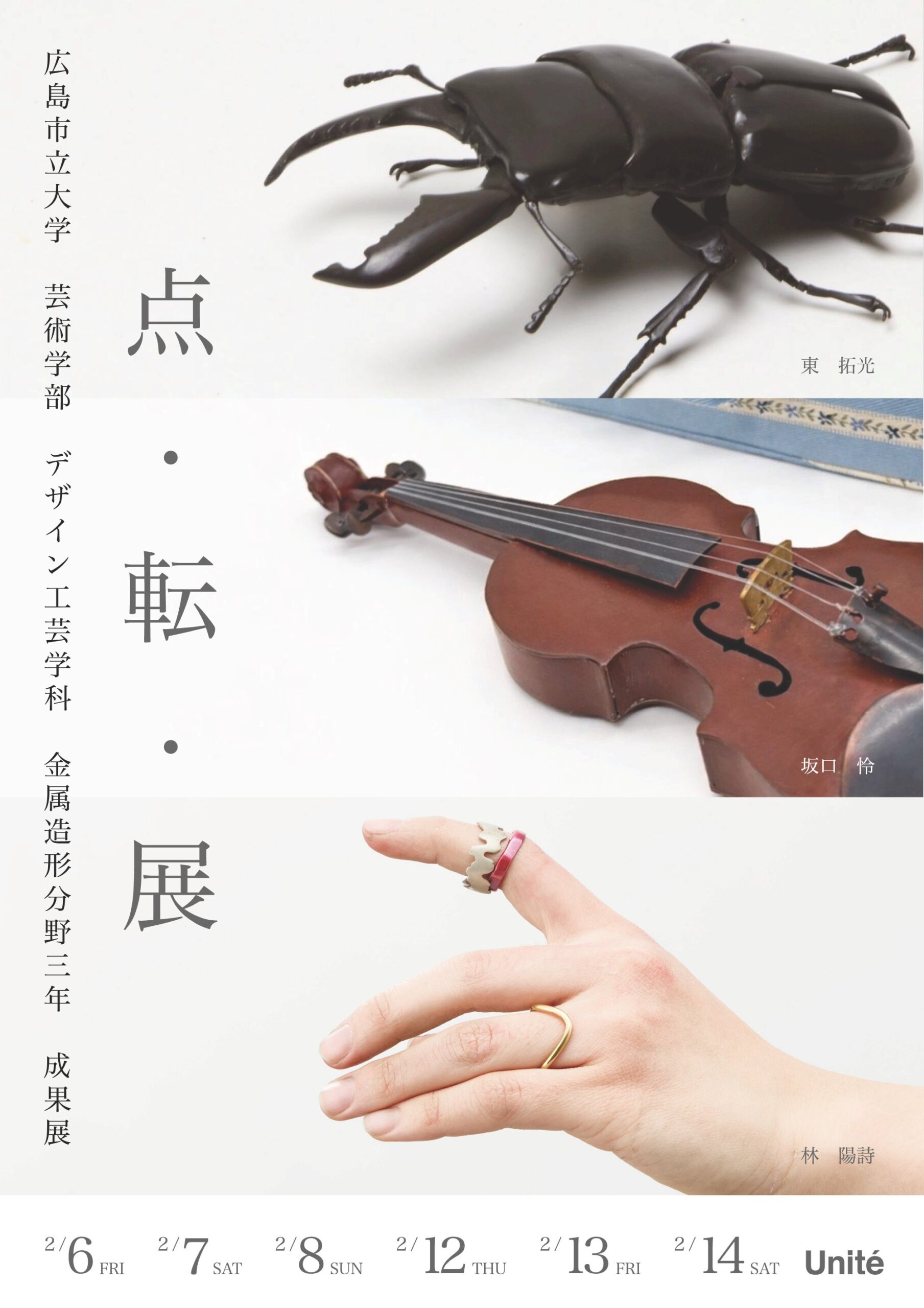 広島市立大学で金属造形を専攻する学生3名による、日頃の制作成果を発表する展示会です。同じ環境で学びながらも、それぞれが異なる視点と技法で金属という素材に向き合ってきました。