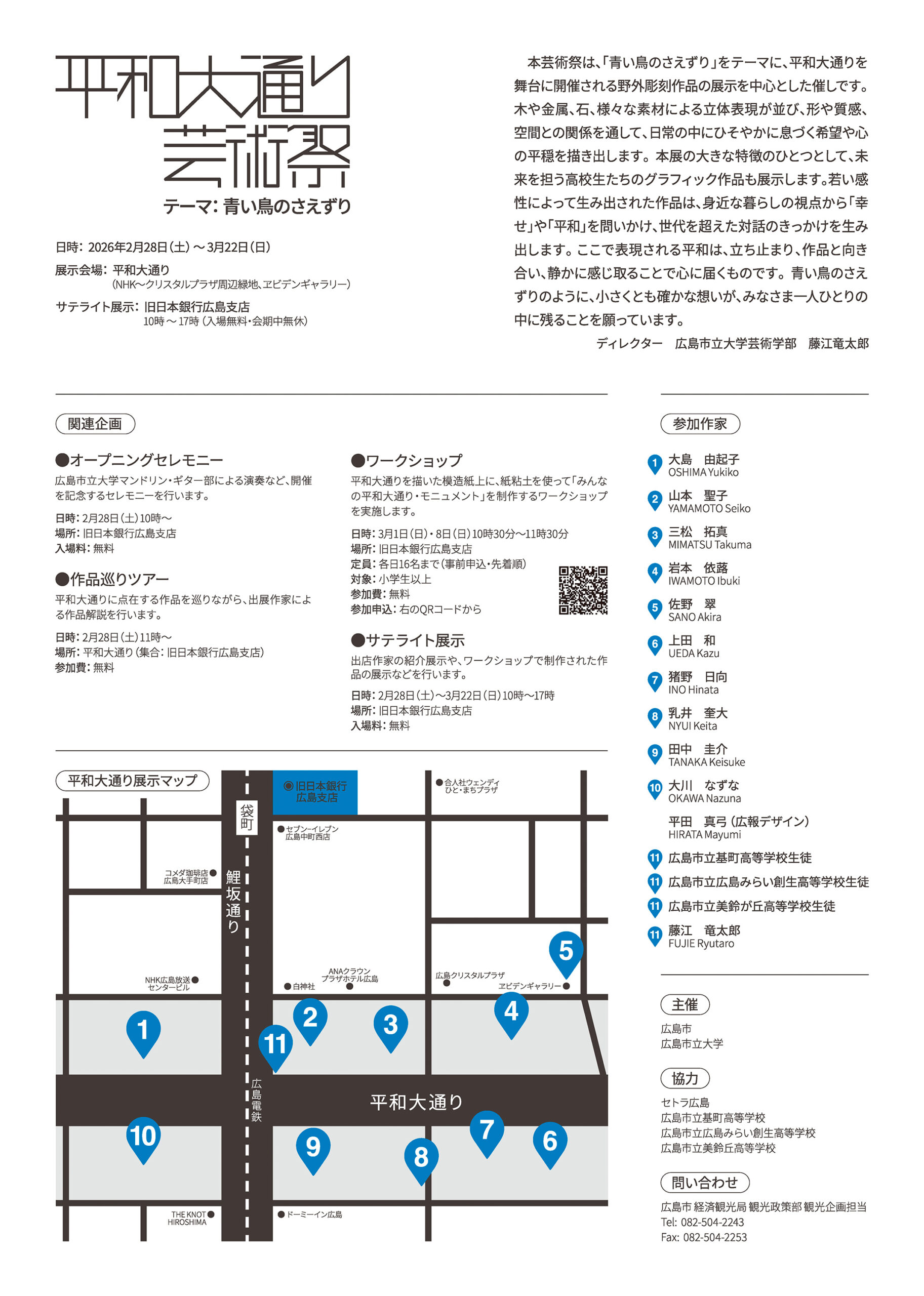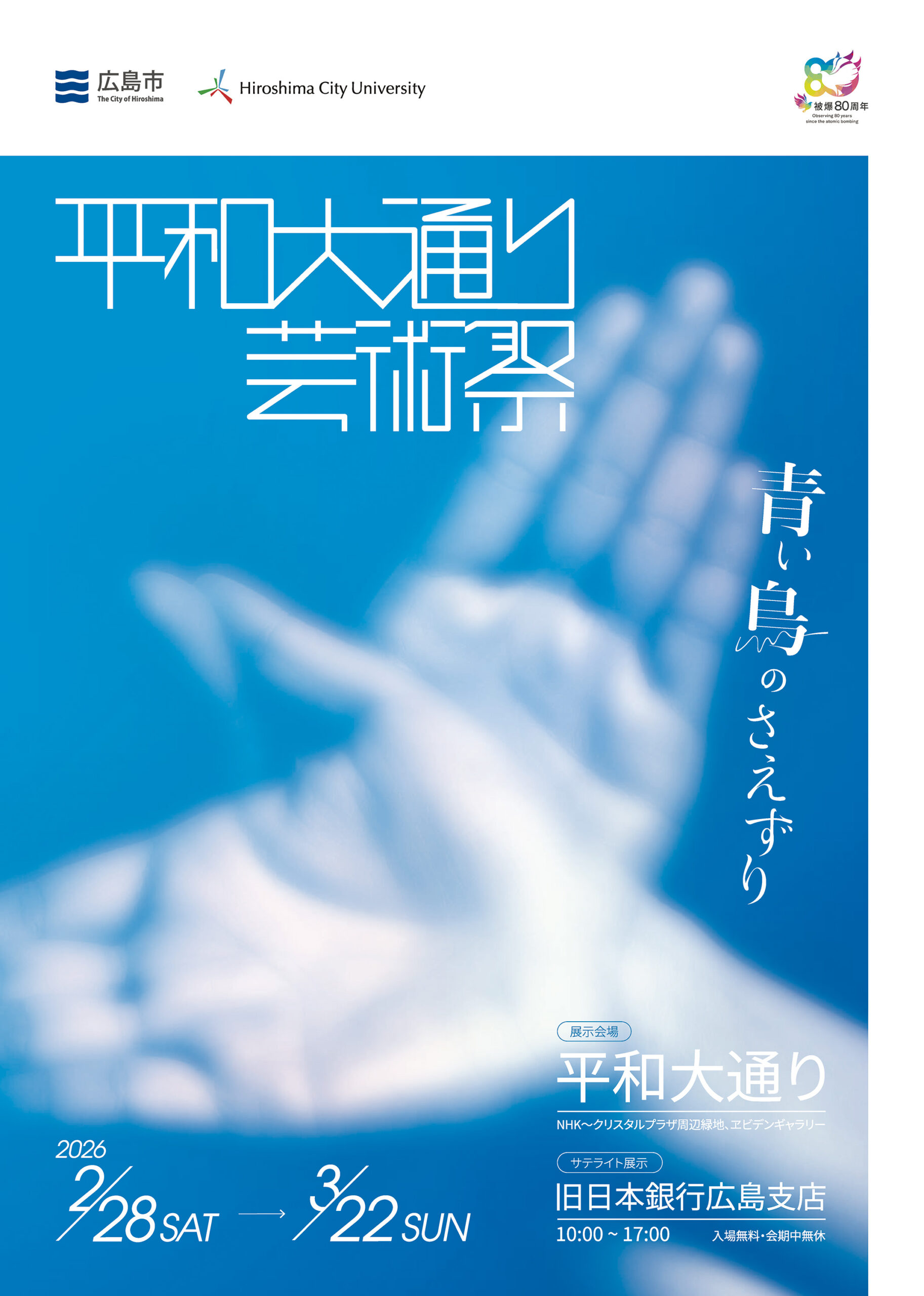 被爆80周年記念事業として、広島市と広島市立大学は「平和大通り芸術祭 青い鳥のさえずり」を2026年2月28日から3月22日まで開催します。会場は平和大通り緑地帯や旧日本銀行広島支店周辺。市立大学教員・学生、市立高校生らによる11作品を展示します。作品巡りツアーやワークショップなど関連企画も予定しています。